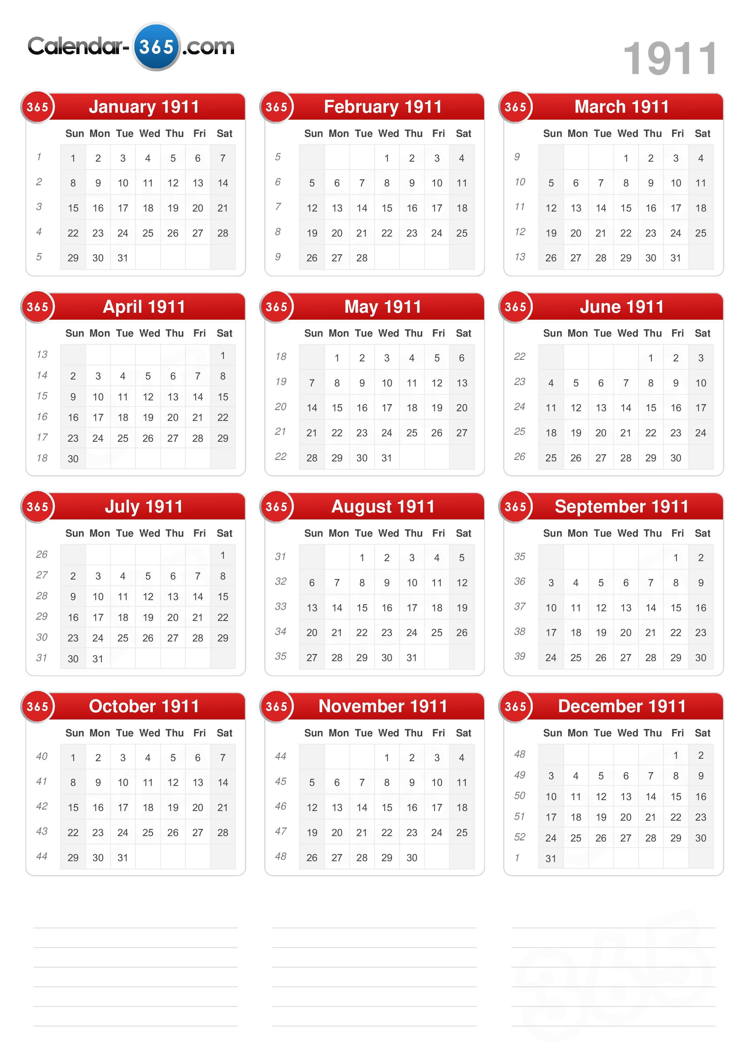 The 1911 calendar is automatically generated and can always be visited online. Also month calendars in 1911 including week numbers can be viewed at any time by clicking on one of the above months. Additionally you can view also leap years, daylight saving, current moon phase in 1911, moon calendar 1911, world clocks and more by selecting an item in the menu above.See also the 1912 Calendar.