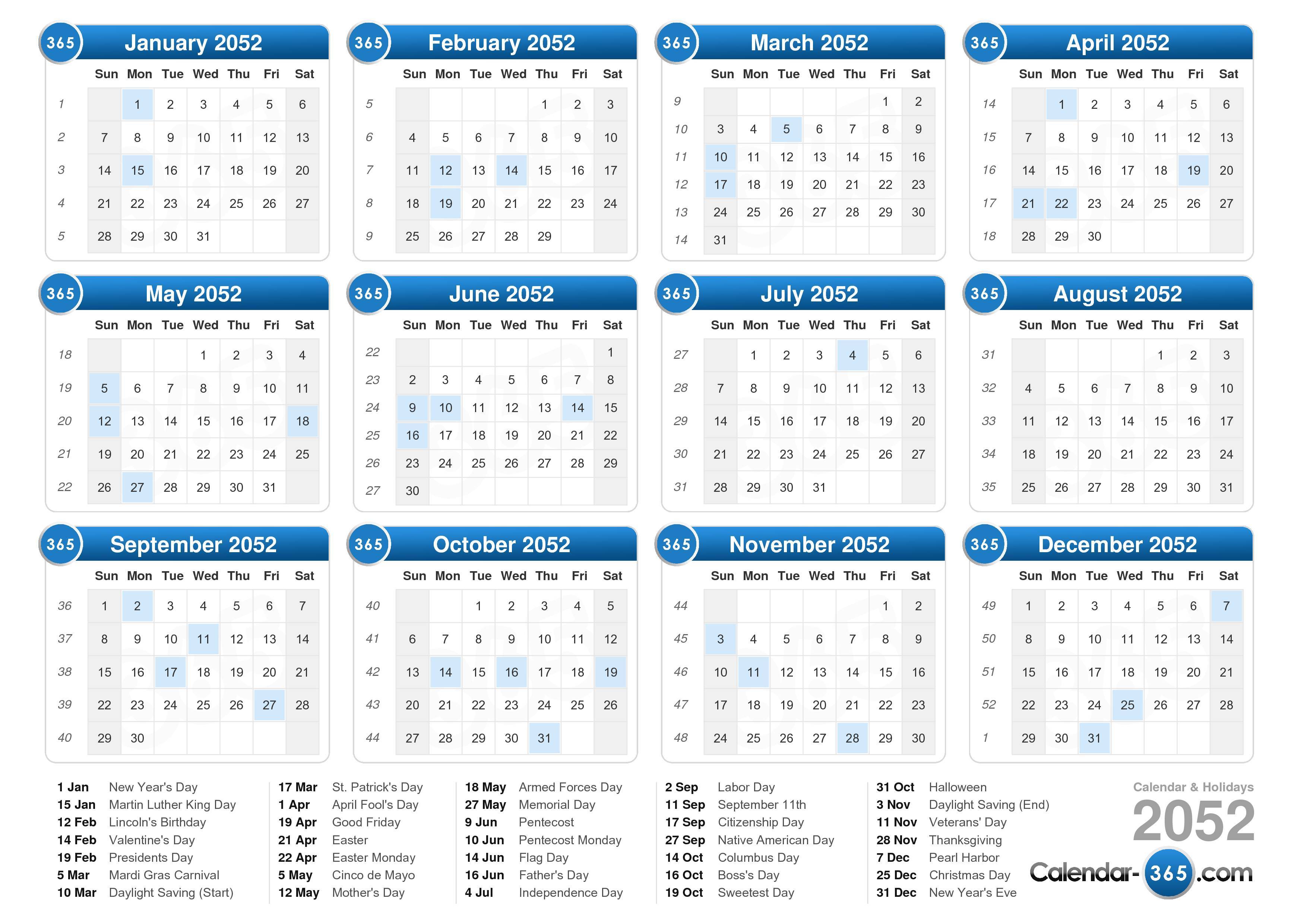 Download the printable 2052 calendar with holidays.