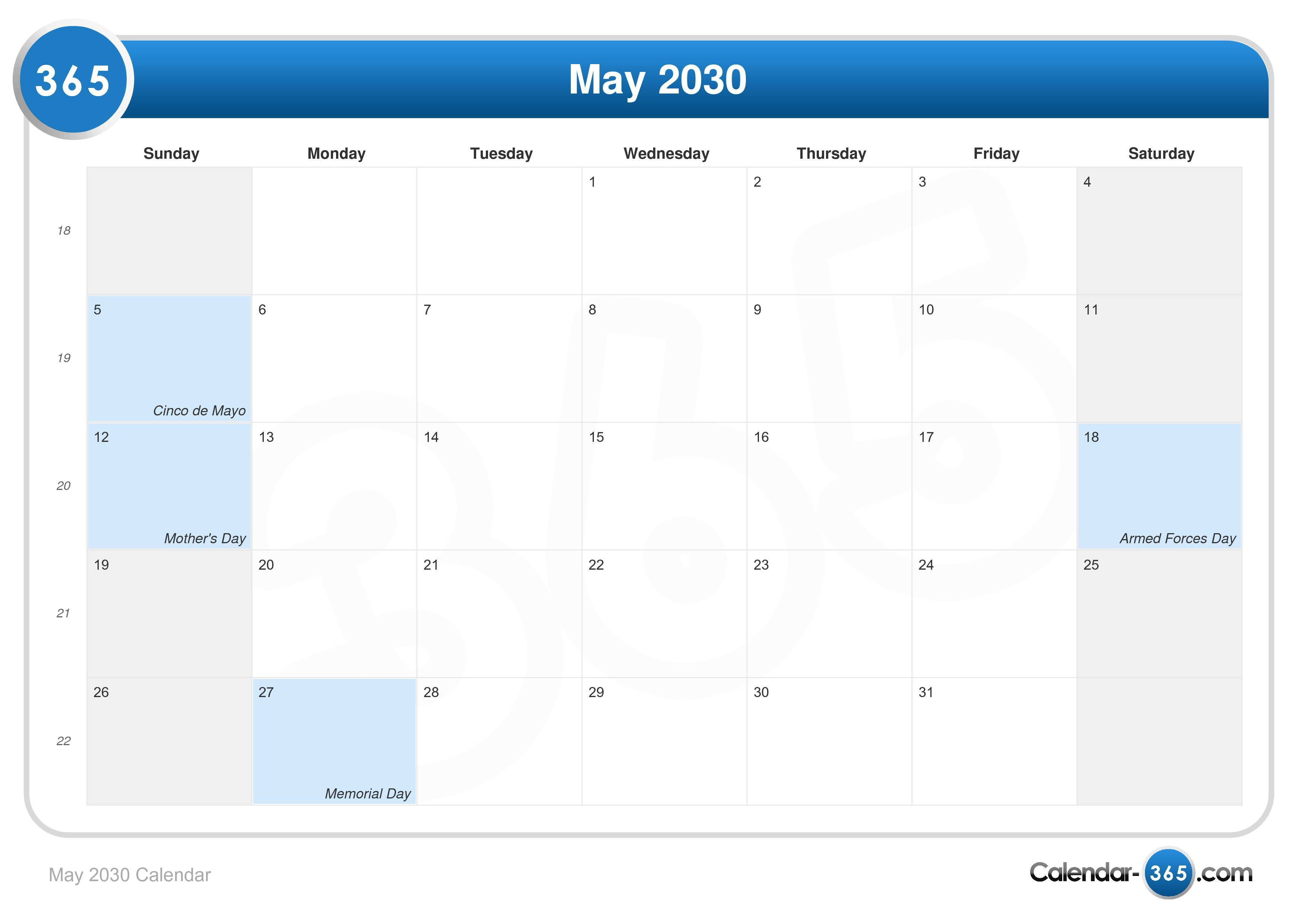 May 2030 Week Su Mo Tu We Th Fr Sa 18 1 2 3 4 19 5 6 7 8 9 10 11 20 12 13 14 15 16 17 18 21 19 20 21 22 23 24 25 22 26 27 28 29 30 31