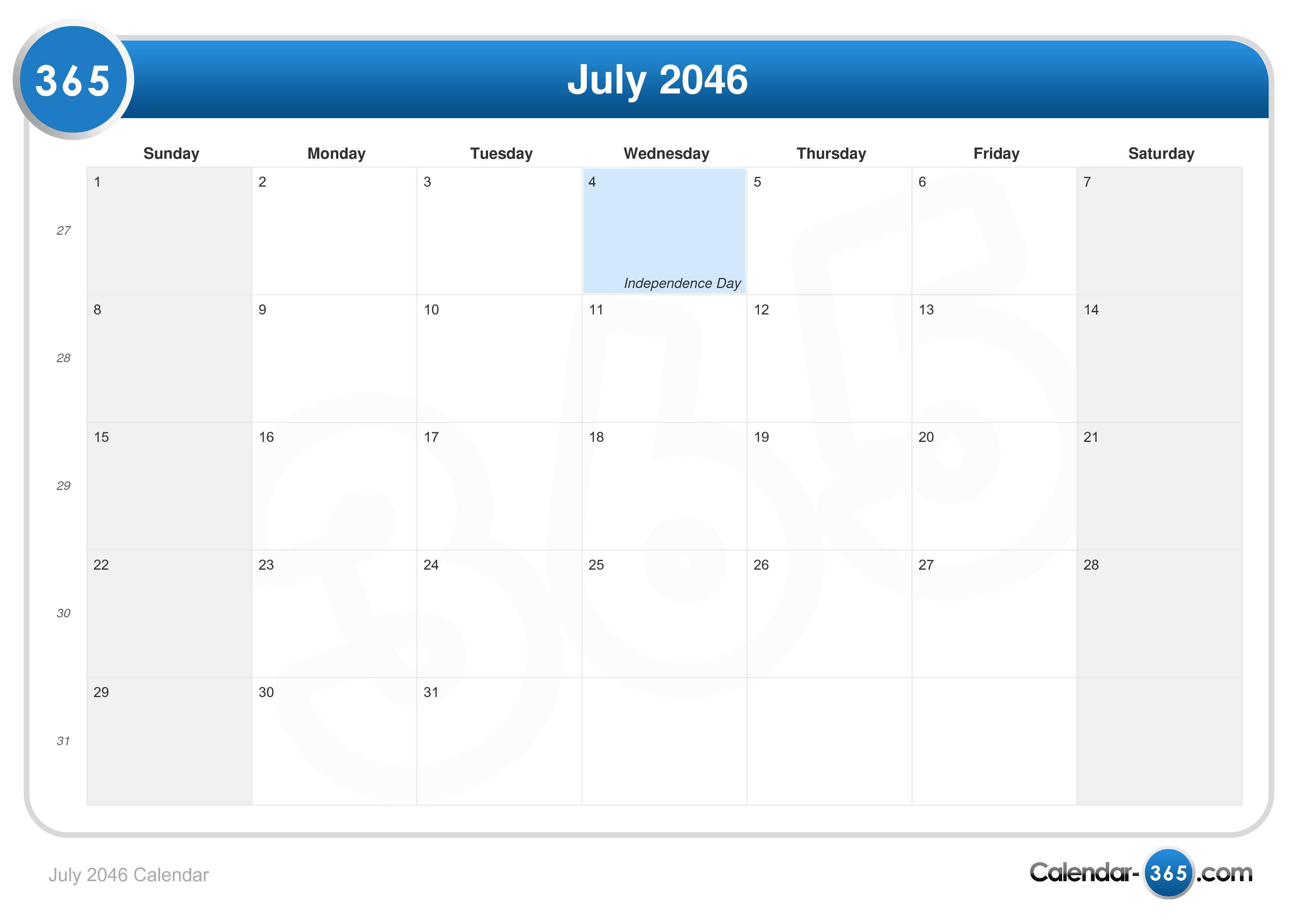 July 2046 Week Su Mo Tu We Th Fr Sa 27 1 2 3 4 5 6 7 28 8 9 10 11 12 13 14 29 15 16 17 18 19 20 21 30 22 23 24 25 26 27 28 31 29 30 31